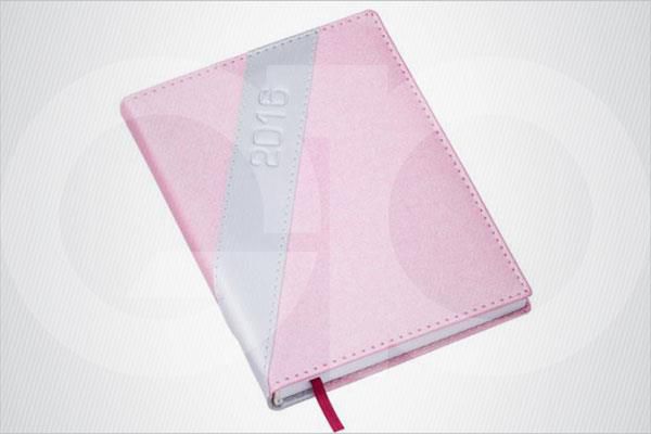 Agenda diária com capa de couro sintético, com baixo relevo de 2016. Aproximadamente 377 folhas.