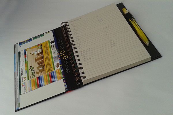 Caderno Personalizado com Porta-Caneta, cadernos prático com porta-caneta (Caneta Opcional), capa dura, revestida em papel reciclado 120gr, impressão até 4 cores, acabamento Caderno com Porta-Caneta, capa/contra-capa: laminação e empastamento, dados pessoais e calendários, miolo com 100 folhas em papel reciclado 75gr, impressão 1x1 cor, layout exclusivo para cada cliente, fechamento com espiral metálicos duplo anel, wire-o, medidas: 17x21cm. * Imagem meramente ilustrativa.