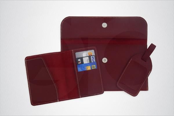Kit viagem completo composto por pasta em couro sintético, porta passaporte em couro sintético e porta tag de mesmo material. Uma gravação em baixo relevo já inclusa.
